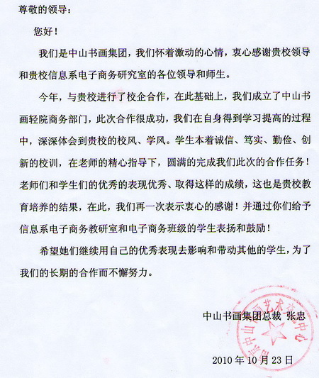 近日,我院周大農院長收到了我院信息系校企合作單位——中山書畫集團的一封感謝信,信中,中山書畫集團對我院領導和信息系電子商務專業師生表示感謝,感謝學院領導、教師的辛勤栽培,感謝學院電子商務專業學生的踏實勤奮的工作態度。