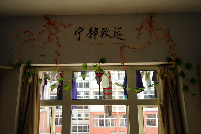 宿舍內部的設計美觀新穎、布局合理、裝飾別致,給人以家的感覺。有的折了上百只千紙鶴做吊墜、做窗簾;有的自己書寫對聯及畫;有的用塑料袋做大樹……各宿舍的名稱更加是創意無限、經典大方,如:“海闊天空屋”、“童話閣”、“溫暖樂園”、“甜蜜港灣”等等,真是千姿百態,寓意深長。