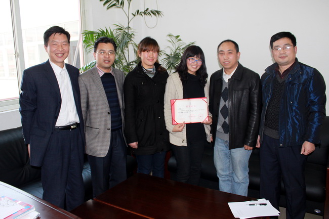 獲得第二屆全國學生規(guī)范漢字書寫大賽高校組一等獎的藝術設計系09廣告331班的劉蕊同學以及三等獎獲得者09造型331班李方圓同學載譽歸來,藝術設計系黨總支金培珍書記、方四文主任、檀祝平副書記于11月18日在工訓樓109室親切接見了他們及其指導老師孫愛民副教授。獲獎學生及其指導老師與藝術設計系領導進行了座談。