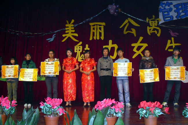 熱情火辣的開場舞 Gee拉開了晚會的序幕,隨后黨總支書記陳文蕾給晚會致詞,關于宿舍管理向同學們提了幾點要求,并預祝晚會圓滿成功。小品《唐伯虎點秋香》構思獨特,惟妙惟肖的表演,幽默詼諧的語言,同學們認真的投入讓現場觀眾捧腹大笑;情歌對唱《如果可以早一點》唱出了現代女性的自立、自強,將本次晚會的主題彰顯的淋漓盡致。此次頒獎晚會上,黨總支書記陳文蕾為獲得公寓美化設計獎的七個優秀宿舍頒了獎,并鼓勵他們繼續保持。同時,