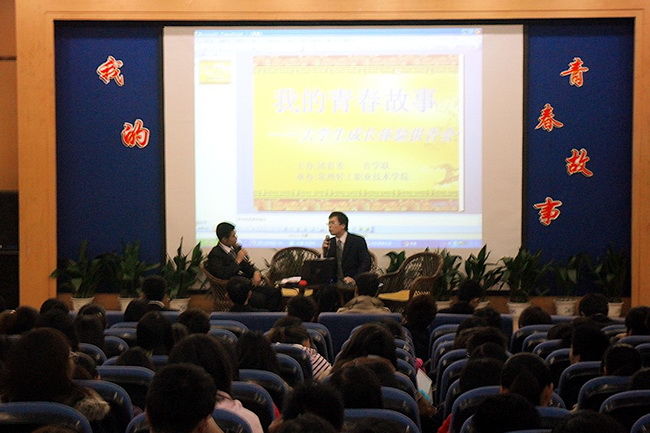 報告會以訪談形式為主,其中穿插了表演,朗誦等多元素的方式,更加形象生動的表現(xiàn)了四位嘉賓的魅力與才華。受邀的四位嘉賓分別是:江技師的“學(xué)習(xí)之星” 戚文豐、常州工學(xué)院的創(chuàng)業(yè)之星梁超、常州輕工職業(yè)技術(shù)學(xué)院的技能之星段永超和來自常州機電職業(yè)技術(shù)學(xué)院電氣工程系電子0932班的耿高鵬的舍友。嘉賓們平實的語言、幽默的話句、 其中穿插的淡淡的辛酸深深的吸引住臺下的大一新生們……