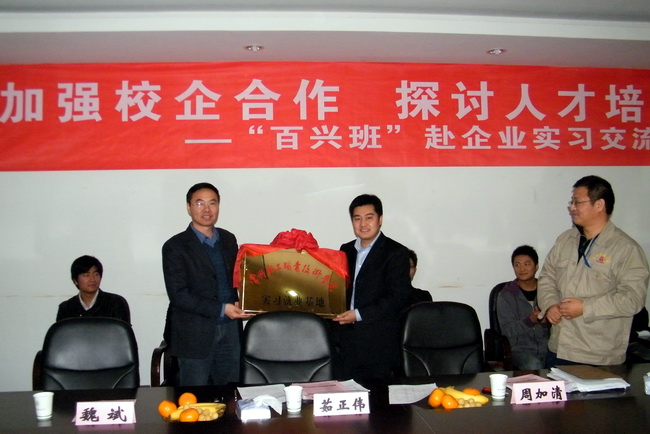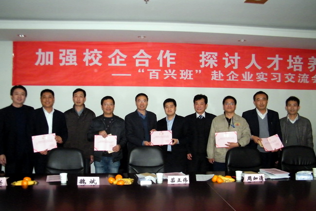 2010年11月30日,電子系08百興班赴中國百興集團(tuán)頂崗實習(xí)啟動儀式暨百興集團(tuán)與電子系校企合作座談會在圖文樓1006舉行。由百興集團(tuán)總經(jīng)理茹正偉帶隊的6位專家、院黨委副書記張濤、市場部部長葛天林、電子系領(lǐng)導(dǎo)及相關(guān)教師、08百興班全體學(xué)生參加了此次會議。電子系黨總支書記莊麗娟主持了會議。