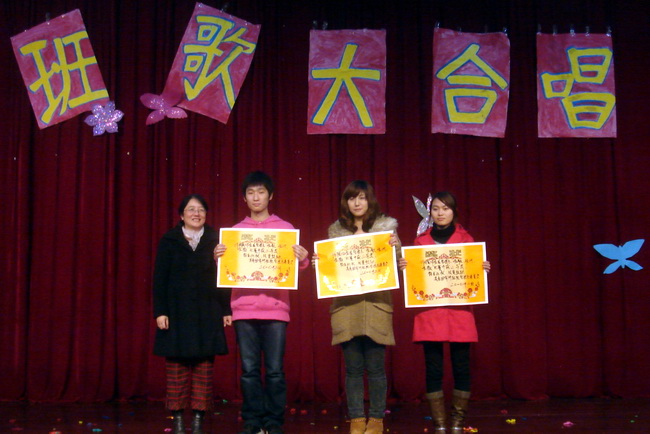 那一首首動人的班歌,是集體情懷的抒發。在優美的旋律,感動的言語中,是心靈最淳樸的聲響。10國貿331班在燭光中讓《愛因為在心中》,10財會331班用手語讓《陽光總在風雨后》,10營銷631班讓寫著《最初的夢想》的粉色氣球在天空放飛。09商英332的《ONLY ONE》,09國貿332的《我相信》,09財會331班改版的《加速度》等等,大家都在用自己最熱忱的心投入到比賽當中,因為“我們是一家人,相親相愛的一家人”,快樂悲傷大家一起分擔,班級榮譽大家一起勇創。