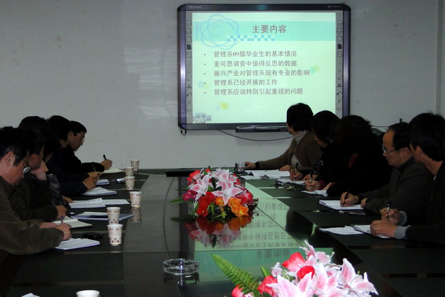 楊海清主任從管理系09屆畢業(yè)生的基本情況、麥可思調(diào)查中值得反思的數(shù)據(jù)、振興產(chǎn)業(yè)對(duì)管理系現(xiàn)有專業(yè)的影響、管理系已經(jīng)開展的工作和管理系應(yīng)該特別引起重視的問題等五個(gè)方面進(jìn)行了深度剖析。她指出管理系已經(jīng)并將繼續(xù)從以下七個(gè)方面開展工作:1)立足現(xiàn)有專業(yè),適度擴(kuò)展專業(yè)方向;2)搭建管理系公共平臺(tái)課;3)全面推進(jìn)雙證融通課程體系;4)工學(xué)結(jié)合試點(diǎn)開始運(yùn)行;5)優(yōu)化師資結(jié)構(gòu),全面提升教師隊(duì)伍;6)面向工科專業(yè),培養(yǎng)復(fù)合型人才;7)以競(jìng)賽促技能,以競(jìng)賽擴(kuò)影響。楊主任還特別提到了管理系應(yīng)該特別引起重視的問題,指出針對(duì)國(guó)貿(mào)、營(yíng)銷專業(yè)就業(yè)率、對(duì)口率低而離職率高的問題,專業(yè)教師和就業(yè)指導(dǎo)時(shí)應(yīng)該更為務(wù)實(shí);針對(duì)我系學(xué)生第一職位是文職的問題,我系后期教改要注重其優(yōu)勢(shì)和不可替代性的培養(yǎng);針對(duì)管理系目前面臨的雙重?cái)D壓(內(nèi)得不到重點(diǎn)項(xiàng)目和資金支持,外與高職經(jīng)貿(mào)類院校相比沒有專業(yè)群的支持),我系要在彰顯特色和提高學(xué)生職場(chǎng)競(jìng)爭(zhēng)力和發(fā)展力方面繼續(xù)深入探討和研究。