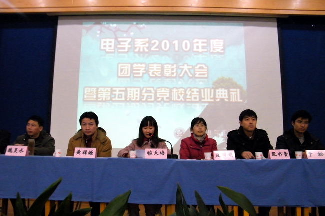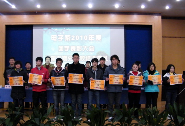 電子系黃祥源副主任宣讀了表彰決定。接著大會對本年度在各項團學工作中表現突出的先進集體和個人以及服務十七屆省運會的全體志愿者進行了表彰并頒發了獎狀和獎品。同時為電子系第五期黨校順利結業的122名學員頒發了黨校結業證書。黨校的學員代表徐廣水和趙偉光兩名同學也向大會匯報他們的學習心得和實踐體驗。
