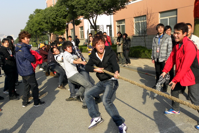 比賽實(shí)行單淘汰制,三局兩勝,勝者晉級(jí)下一輪。要求必須是男女生混合組隊(duì)。隨著裁判一聲哨響,比賽正式開始。雙方隊(duì)員握緊繩索,一個(gè)個(gè)腳相扣,身體后傾,拼命拉繩子。只見中間的紅絲帶一會(huì)向左,一會(huì)向右,僵持在那里……同學(xué)們的歡呼聲,跺腳聲,吶喊助威聲混成一片……經(jīng)過幾輪激烈角逐,最終10會(huì)展331班拔得頭籌,勇奪冠軍。