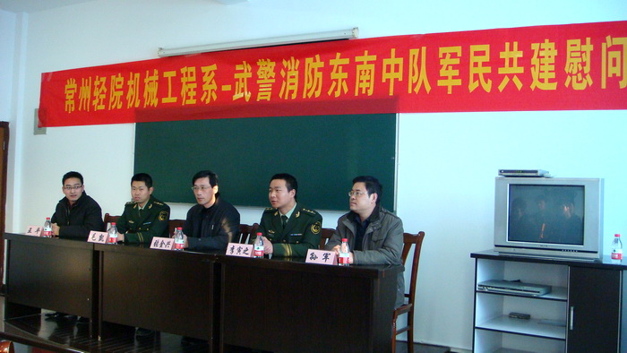 軍愛民、民擁軍是我國(guó)的優(yōu)良傳統(tǒng)。為加深與軍民共建單位——武警消防常州支隊(duì)東南中隊(duì)的傳統(tǒng)友誼,在元旦即將來(lái)臨之際,12月29日,機(jī)械工程系組織了慰問武警消防官兵的雙擁共建活動(dòng)。系黨總支書記張金興、系黨總支副書記孫軍、系治保委員王平以及系籃球隊(duì)10名學(xué)生隊(duì)員帶著慰問品來(lái)到武警消防常州支隊(duì)東南中隊(duì),向武警消防官兵致以節(jié)日的問候,受到東南中隊(duì)指導(dǎo)員毛凱、中隊(duì)長(zhǎng)李寅之和全體消防戰(zhàn)士的熱烈歡迎。