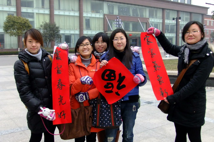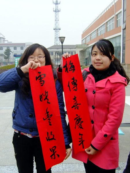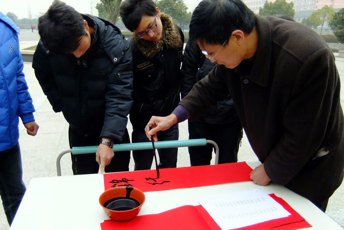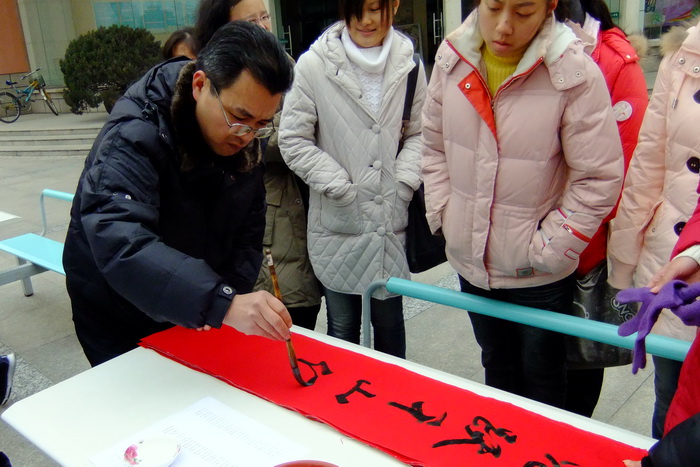 “寫春聯,貼春聯,歡歡喜喜過大年”。紅彤彤的春聯是中華傳統的民間習俗,寄托著人們對新年的美好希望和企盼。1月5日下午,信息工程系書法協會在第一食堂門口舉辦了“歡樂中國年——對聯大派送”活動,書法協會的指導老師孫愛民與其他幾位常州書法名家及書法協會成員一起為師生們現場書寫春聯,贈與春聯,將新春的美好祝福一并送出。盡管當天溫度很低,但活動現場一直熱鬧非凡,洋溢著濃烈的喜慶氣氛,很多同學老師拿著新鮮出爐的春聯作品愛不釋手,開心之情溢于言表。此次活動不僅為迎接新年增添了歡樂祥和的氣氛,更使同學們對傳統文化進一步加深了認識。老師書寫對聯老師書寫對聯對聯展示對聯展示
