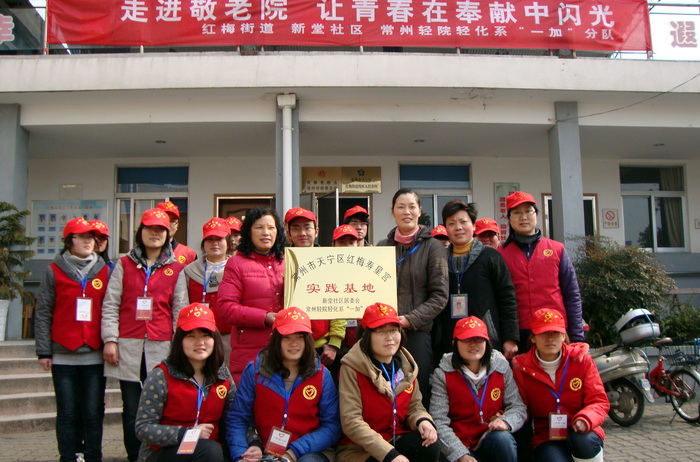 為弘揚并踐行雷鋒精神,樹立科學發展觀,從身邊小事做起,用實際行動為他人送去溫暖、送去愛心,把“熱愛生活,奉獻群眾”的精神更好地體現于日常生活的具體行動當中。2011年3月5日,由常州輕院輕化工工程系組織的“一加”志愿者分隊赴常州市紅梅街道新堂社區的紅梅壽星宮開展了以“走進敬老院,讓青春在奉獻中閃光”為主題的系列活動。