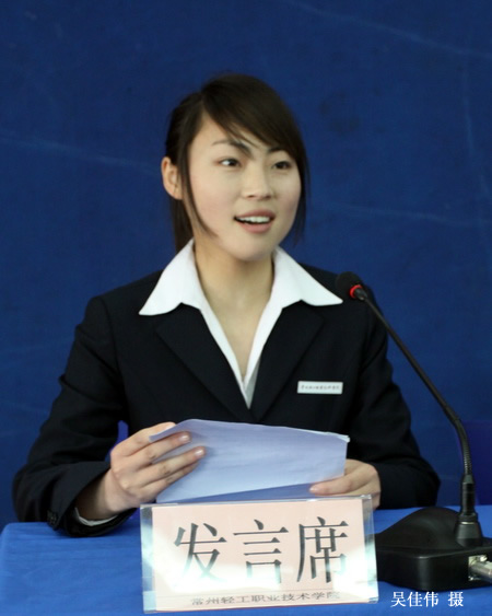 指導教師代表信息工程系王霞俊老師和參賽選手代表旅游系11酒管333班陳歡同學分別在會上發(fā)言。