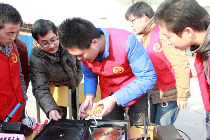 電子系退休老教師、關(guān)工委成員王方大同志主動(dòng)聯(lián)系了馬杭社區(qū),也得到了社區(qū)的積極響應(yīng)。志愿者們剛進(jìn)社區(qū),已經(jīng)有大批群眾在等侯歡迎了。本次社區(qū)服務(wù)主要分為三項(xiàng):家電維修、手機(jī)維修和拍照服務(wù),分別由電子系的家電維修協(xié)會(huì)、手機(jī)維修協(xié)會(huì)和流光映紀(jì)拍客俱樂部三個(gè)社團(tuán)承辦。本次活動(dòng)成功維修家用電器15件,手機(jī)8部,為近百名社區(qū)居民拍了證件照,活動(dòng)得到了社區(qū)居民的一致好評!