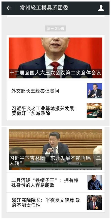 模具系團委微博和微信也在實時關注兩會,隨時向廣大學生們轉播兩會實況、焦點議案,給同學們提供交流平臺。