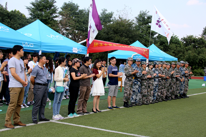 烈日炎炎,9月16日下午,電子系黨總支副書記麻麗娟、系團委書記韓楊、全體輔導員老師及團委學生會成員一行來到足球場看望正在軍訓的教官和新生并帶來精彩的慰問演出。