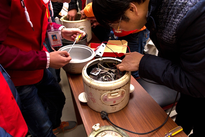 公益維修服務(wù)隊(duì)一行到達(dá)長(zhǎng)虹社區(qū)居委會(huì)后,受到了關(guān)工委老師和社區(qū)工作人員的熱切歡迎。隨后,長(zhǎng)虹社區(qū)的居民紛紛把損壞的電飯鍋,插座,電熱水壺、收音機(jī)等小家電搬來(lái)居委會(huì)公益維修現(xiàn)場(chǎng),居民們對(duì)志愿者的到來(lái)既好奇又感謝,據(jù)居委會(huì)工作人員介紹,小區(qū)住戶(hù)中有很多老年住戶(hù),有不少存在安全隱患的電器和故障的情況,這次活動(dòng)真正幫助街坊鄰居解決了生活中的實(shí)際困難。志愿者們?cè)谥笇?dǎo)老師的指導(dǎo)下,進(jìn)行現(xiàn)場(chǎng)“會(huì)診”維修,并對(duì)癥“下藥”。考慮到社區(qū)內(nèi)有些居民行動(dòng)不便,同學(xué)們?cè)诖酥笥痔匾膺M(jìn)行了上門(mén)維修。一些無(wú)法維修或者有安全隱患的家用電器,志愿者們也進(jìn)行了耐心的解釋說(shuō)明。雖然忙碌,同學(xué)們的臉上露出的卻是欣慰的笑容。活動(dòng)現(xiàn)場(chǎng),同學(xué)們服務(wù)周到,細(xì)致耐心,技術(shù)專(zhuān)業(yè)的服務(wù)態(tài)度和理念得到了當(dāng)?shù)鼐用竦呐氖址Q(chēng)贊。