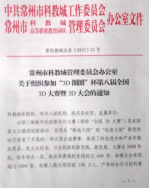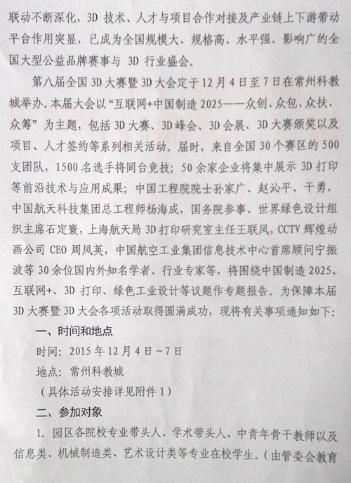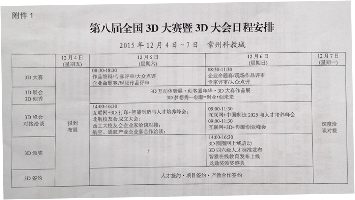 全國三維數字化創新設計大賽(簡稱“全國3D大賽”)定于2015年12月4日-7日在科教城舉行,如有感興趣的教師或學生可根據大會日程安排自行前往觀摩學習。