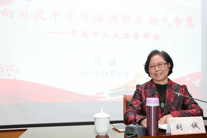 劉誠教授在報告中將十九大與七大、十二大進行類比,稱其為中共黨史的第三座里程碑,凸顯了十九大的重要歷史地位,進而高屋建瓴,引經據典,從五個方面詳述了習近平治國理政的大智慧,她認為:十九大報告對國情發展階段的準確判斷,是治國理政的第一要義;十九大報告是對過往五年的謀篇布局和對今后發展高屋建瓴的頂層設計;十九大報告體現了黨的指導思想與時俱進;十九大報告是戰略指引,體現了中國共產黨治國理政的基本方略和主要任務;十九大報告指出,黨的領導是實現中國夢的根本保證,全面從嚴治黨永遠在路上。