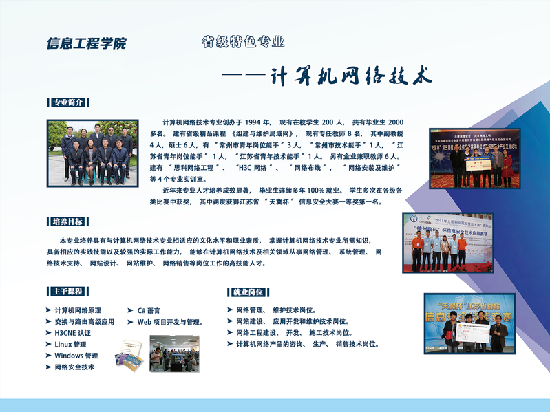 計算機網絡技術專業創辦于1994年,現有在校學生450人,其中留學生50多人,目前已有畢業生3000多名。2019年被評為“江蘇省成人高等教育重點專業”,建有“省級精品精品資源共享課程”2門。