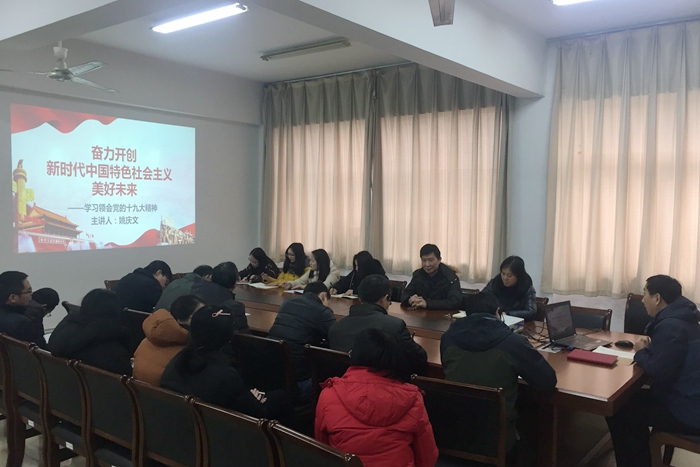 為常態化深入學習貫徹黨的十九大精神,進一步凝聚共識,1月24日下午,材料工程與技術學院黨總支組織開展了學習貫徹黨的十九大精神專題黨課。學院副院長姚慶文為材料工程與技術學院全院教師和學生黨員上了一堂生動的十九大專題黨課,黨課由材料學院黨總支副書記王蘭萍主持。