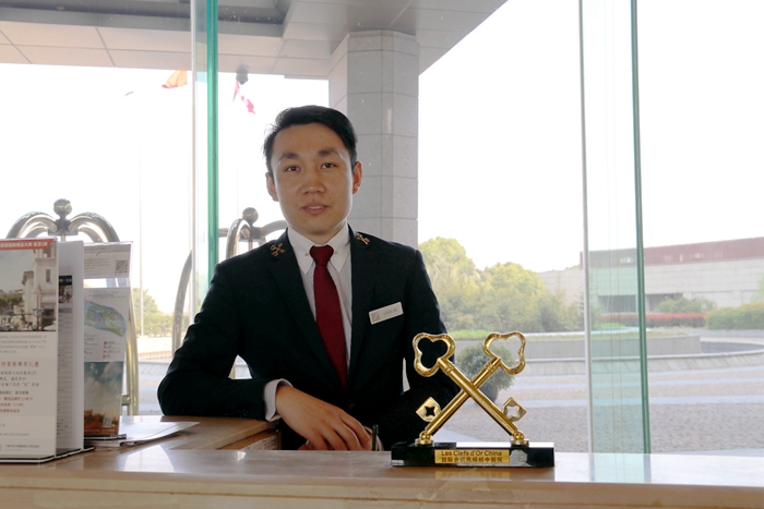 后來(lái)才知道,他偶爾聽(tīng)了一次星級(jí)酒店來(lái)招人的宣講會(huì),并深深地愛(ài)上了酒店管理這一行。畢業(yè)實(shí)習(xí)時(shí)他去了常州香格里拉酒店做禮賓——奧,就是老電影里上海灘大酒店為客人開(kāi)門關(guān)門拎行李的門童——客人被他的微笑服務(wù)所陶醉,不斷地給小費(fèi),讓他成了班級(jí)的富翁,老是被同學(xué)“敲竹杠”請(qǐng)吃飯。2011年從業(yè)滿5年,他有資格申請(qǐng)金鑰匙資格,金雞湖凱賓斯基大酒店看好他的潛質(zhì),花大錢送他去培訓(xùn),同年在四川成都參加了授徽儀式,所在酒店也因此有資格在大堂服務(wù)臺(tái)擺上了一個(gè)大約20公分高的金鑰匙標(biāo)志,向客人宣示酒店的品牌。