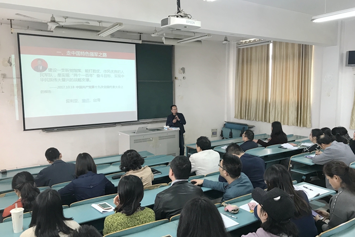 為深入學(xué)習(xí)貫徹習(xí)近平新時代中國特色社會主義思想和黨的十九大精神,全面理解把握新時代新要求新挑戰(zhàn),11月14日,材料工程與技術(shù)學(xué)院和電氣工程與技術(shù)學(xué)院共同開展“十九大精神”宣講,內(nèi)容為《走中國特色強軍之路,推進國家統(tǒng)一,構(gòu)建人類命運共同體》。本次宣講由馬克思主義學(xué)院張永林老師主講,材料學(xué)院、電氣學(xué)院全體教師參加了宣講。