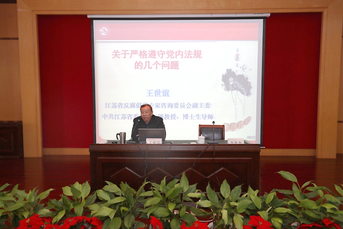 11月20日下午,我院黨委中心組(擴(kuò)大)學(xué)習(xí)暨“清風(fēng)講堂”講座在教學(xué)樓3201報(bào)告廳舉行,講座邀請江蘇省委黨校教授王世誼作了題為《關(guān)于嚴(yán)格遵守黨內(nèi)法規(guī)的幾個(gè)問題》的報(bào)告,全體校領(lǐng)導(dǎo)出席,科級(jí)以上干部、各黨總支委員、各黨支部書記和支部委員、黨風(fēng)廉政建設(shè)信息聯(lián)絡(luò)員參加本次講座,講座由校長楊勁松主持。