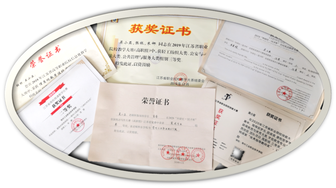 專業(yè)教師團(tuán)隊(duì)結(jié)構(gòu)合理,銳意進(jìn)取,在各級(jí)各類競(jìng)賽中屢獲佳績(jī),近三年獲江蘇省高職院校信息化教學(xué)大賽一等獎(jiǎng)1項(xiàng),二等獎(jiǎng)1項(xiàng);江蘇省職業(yè)院校教學(xué)能力大賽高職組三等獎(jiǎng)1項(xiàng);江蘇省高校微課教學(xué)比賽二等獎(jiǎng)1項(xiàng)。指導(dǎo)學(xué)生參加省市技能競(jìng)賽,獲“外研社杯”全國(guó)英語(yǔ)演講大賽(江蘇賽區(qū))獲一等獎(jiǎng)1項(xiàng),三等獎(jiǎng)2項(xiàng);“外研社杯”全國(guó)英語(yǔ)寫作大賽(江蘇賽區(qū))二等獎(jiǎng)2項(xiàng),三等獎(jiǎng)1項(xiàng);江蘇省高職院校藝術(shù)插花技能大賽二等獎(jiǎng)1項(xiàng),三等獎(jiǎng)1項(xiàng);江蘇省高等職業(yè)院校技能大賽英語(yǔ)口語(yǔ)賽項(xiàng)三等獎(jiǎng)1項(xiàng),學(xué)前教育專業(yè)教育技能賽項(xiàng)三等獎(jiǎng)2項(xiàng)。