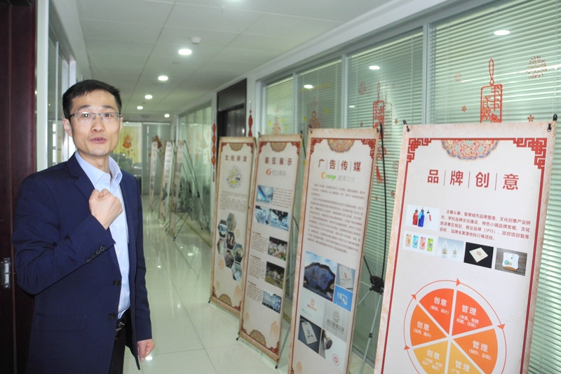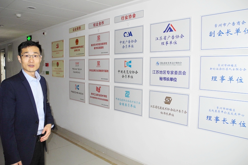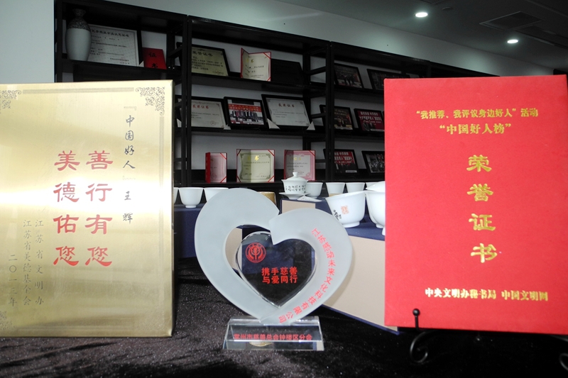 位于鐘樓區的常州科技街占地3.7平方公里,王輝的江蘇感動未來文化科技有限公司是該區域最大的廣告文創公司了。公司租用了1000多平米的辦公用房,王輝帶我走進他的406室展示廳。展示廳內滿桌擺放的都是公司為客戶設計制作的陶瓷禮品,此外最霸占眼球的,就是展架上那上百幀照片和證書:中國展覽工程企業一級資質、中國廣告企業一級資質、中國展覽館展陳工程設計施工一體化一級資質、建筑裝修裝飾工程專業承包二級資質、建筑幕墻工程專業承包二級資質,江蘇省創業典型、江蘇省廣告協會理事單位、江蘇省優秀誠信服務企業、常州市守合同重信用企業、常州市民營科技企業、常州市廣告商會副會長單位,常州市廣告商會秘書長……讓我意外的是:展架的中央竟然出現了“中國好人”銅牌!