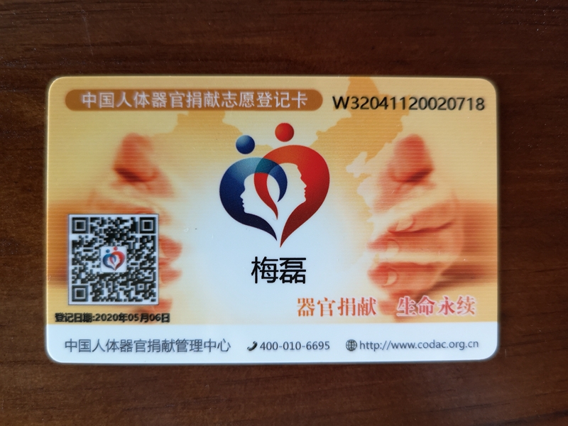 2020年5月6日午夜1點22分,梅磊在自己的微信朋友圈上傳了一張照片:中國人體器官捐獻志愿者登記卡,“梅磊”兩個字,明明白白地印在卡片上。他還附上了一首小詩:“生命的禮物:雖然不知生命之旅何時結束/但當那一刻來臨之時/可留下鮮花一束……”