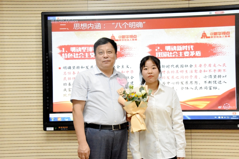 繆昌武老師在授課中注重理論和實踐相結(jié)合,用親切質(zhì)樸的語言和鮮活生動的故事,牢牢抓住青年大學(xué)生思想特點,做到“配方”先進、“工藝”精湛、“包裝”時尚,給學(xué)生提供香味形俱佳的精神大餐,讓他們愿意吃、喜歡吃,把思政課講得“有虛有實”“有情有意”“有滋有味”。他飽含深情地講述自己幾十年親身經(jīng)歷的變化,通過文字和圖片解讀國家的相關(guān)政策。他號召青年學(xué)生要抓住發(fā)展機遇,響應(yīng)國家號召,自覺把個人前途同國家民族的命運緊緊結(jié)合在一起,把個人的學(xué)習(xí)進步同祖國的繁榮富強緊緊聯(lián)系在一起。上課結(jié)束后,經(jīng)貿(mào)管理學(xué)院學(xué)生主動送上鮮花和賀卡,祝福繆昌武老師教師節(jié)快樂。