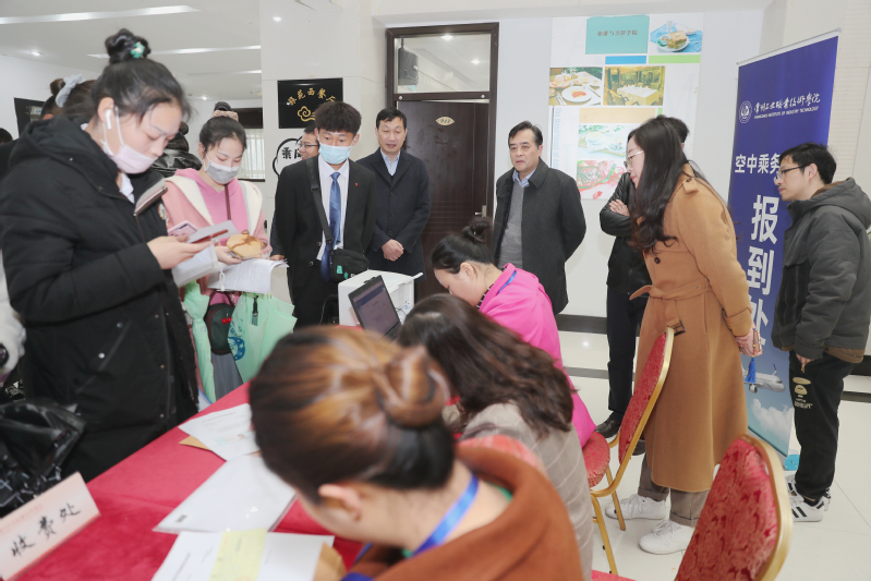 3月19日上午,旅游與烹飪學院舉行空中乘務專業提前招生考試,校黨委書記繆昌武、校長楊勁松、副校長姚慶文來到面試現場,檢查指導學院招生考試工作,并慰問了校企合作單位——北京廣匯京通教育科技有限公司,華東航空醫院體檢中心相關工作人員。