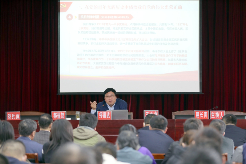為進(jìn)一步拓寬黨支部建設(shè)途徑,不斷提高黨員的思想政治素質(zhì)和理論水平,4月13日上午,我校行政部門黨總支第三黨支部與洛陽鎮(zhèn)綜合行政執(zhí)法局黨支部、洛陽鎮(zhèn)建設(shè)局黨支部、常州弘昌環(huán)境科技有限公司黨支部在洛陽鎮(zhèn)人民政府開展結(jié)對(duì)共建主題黨日活動(dòng)。校黨委書記繆昌武為全體黨員上主題為“不忘初心、以史為鑒、跨越百年、邁向復(fù)興,在黨的百年光輝歷史中開啟新征程”的黨史學(xué)習(xí)教育專題黨課。
