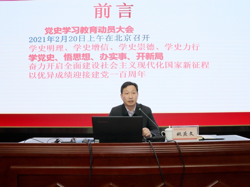 姚慶文從中國共產(chǎn)黨的建立過程、中國共產(chǎn)黨的名稱由來、中國共產(chǎn)黨人的初心和使命三個(gè)方面展開,既有歷史史實(shí),又有現(xiàn)實(shí)思考。姚慶文強(qiáng)調(diào),要把學(xué)習(xí)領(lǐng)悟黨史、新中國史作為黨史學(xué)習(xí)教育的重要途徑,在深入學(xué)習(xí)和不斷領(lǐng)悟中,了解黨史、新中國史的重大事件、重要會(huì)議、重要文件、重要人物,了解我們黨領(lǐng)導(dǎo)人民進(jìn)行艱苦卓絕的斗爭(zhēng)歷程,了解中國近代以來170多年的斗爭(zhēng)史、我們黨100年的奮斗史、新中國70多年的發(fā)展史,了解我們黨的光榮傳統(tǒng)、寶貴經(jīng)驗(yàn)和偉大成就,弄清楚我們從哪里來、往哪里去,弄清楚艱苦卓絕是什么、是怎么來的,弄清楚中國共產(chǎn)黨為什么能,馬克思主義為什么行,社會(huì)主義為什么好;做到知史愛黨、知史愛國,做到常懷憂黨之心、為黨之責(zé)、強(qiáng)黨之志。