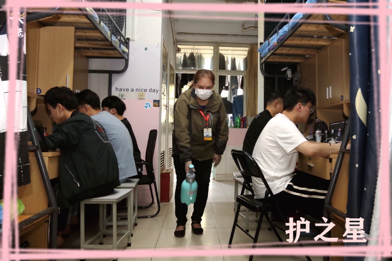 “阿姨”這個稱呼,在校園一向都象征著公寓門前的她們。檢查宿舍衛(wèi)生,保證學(xué)生安全就寢,督促同學(xué)們佩戴口罩,不間斷地清潔、消殺……好像阿姨不再是“阿姨”,更像是每棟學(xué)生公寓里孩子們的母親。細(xì)心呵護(hù),貼心照料,看見她們的笑臉便倍感安心。她們是校園里的一顆顆“護(hù)之星”。