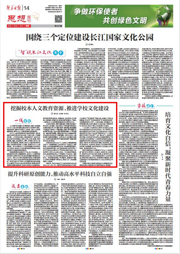 6月14日,《新華日報》第14版(理論版)“思想周刊”刊發我校學校文化研究闡釋文章:《挖掘校本人文教育資源,推進學校文化建設》。文章展示了我校借力“校本人文教育資源”進行學校文化建設、涵養工匠精神方面的深度思考。