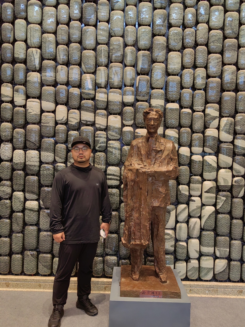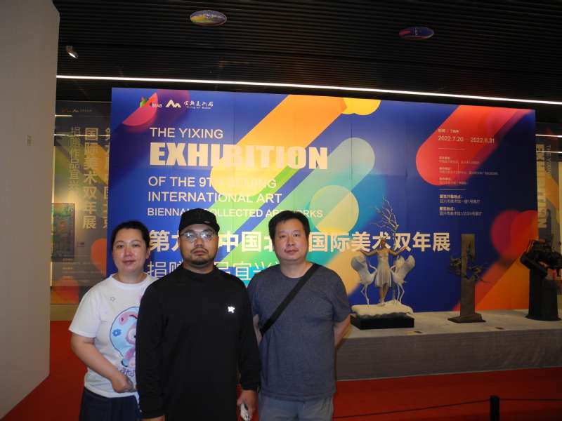 6.與兩位專業(yè)老師劉星(左)和張曄(右)在他設(shè)計(jì)的美術(shù)展覽舞臺(tái)畫面前合影