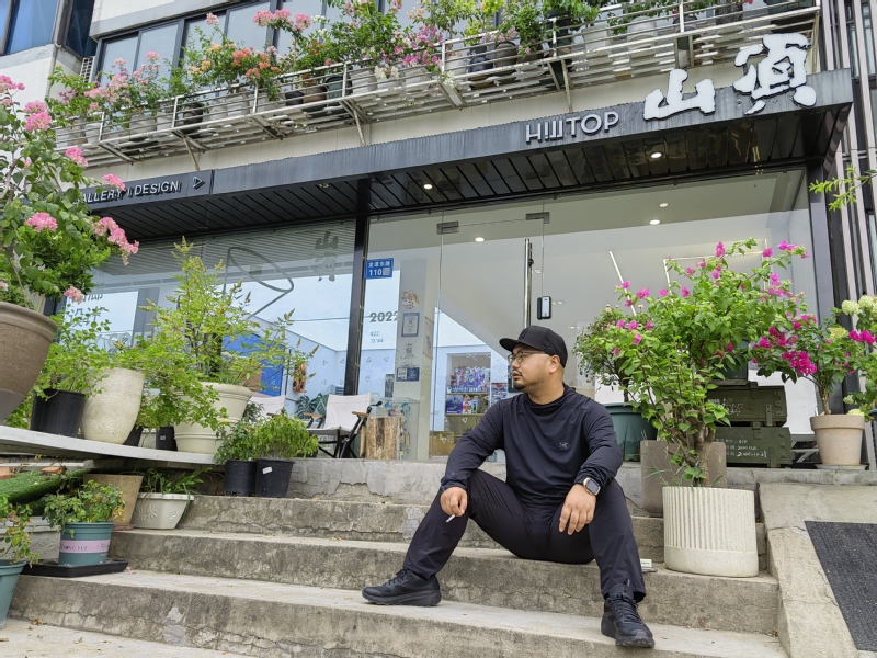 1.周浩楠一身緇衣,坐在“山頂空間”的臺(tái)階上,像梵高一樣思考