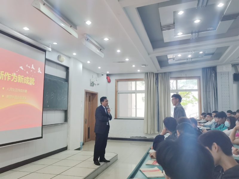 楊勁松以《偉大時代的歷史跨越》為主題,從介紹常州市完備的產業體系、十大先進制造業集群等事例入手,結合機械臂在流水線上作業、熊貓造型光伏電站等生動案例展示了新時代我國在經濟實力、科技實力、綜合國力等方面發生的巨變,并告訴學生,創新是經濟高質量發展的動能。課堂上,楊勁松播放了北京市東城區“小院議事廳”視頻,和學生們一起聆聽了街坊們的“老胡同,新生活”故事,充分感受了城鄉基層民主的有序發展,講述了精準扶貧背后的以人為本理念,并結合在常高校近幾年的學生就業情況,讓學生明白,學生高質量就業也是中國共產黨以人為本的重要體現。