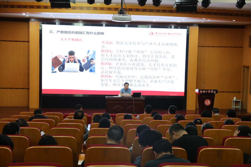 姚慶文結(jié)合主題教育調(diào)研情況,帶領(lǐng)機械與交通學院教師重溫了習近平總書記對科教興國的重要指示,學習了《關(guān)于深化現(xiàn)代職業(yè)教育體系建設(shè)改革的意見》《職業(yè)教育產(chǎn)教融合賦能提升行動方案(2023-2025)》等文件精神,闡釋了產(chǎn)教融合、科教融匯的含義及目標任務(wù),分享了相關(guān)典型案例,審視了學校在產(chǎn)教融合、科教融匯及科研工作中的現(xiàn)實瓶頸,并給出了解決學校產(chǎn)教融合、科教融匯問題的思路方法、路徑舉措。