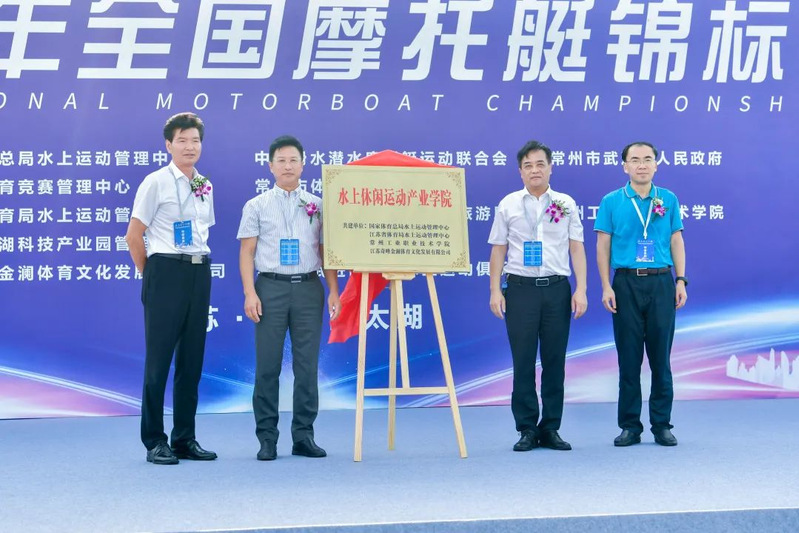 8月19日上午,在風(fēng)光旖旎的西太湖攬?jiān)聻硰V場(chǎng),由國(guó)家體育總局水上運(yùn)動(dòng)管理中心、江蘇省體育局水上運(yùn)動(dòng)管理中心、江蘇奇峰金瀾體育文化發(fā)展有限公司和我校合作共建的水上休閑運(yùn)動(dòng)產(chǎn)業(yè)學(xué)院在2022年全國(guó)摩托艇錦標(biāo)賽開幕式上揭牌成立,國(guó)家體育總局水上運(yùn)動(dòng)管理中心黨委書記、主任李瑞林,江蘇省體育局水上運(yùn)動(dòng)管理中心主任劉翊群、常州市體育局局長(zhǎng)杜吉賓與我校校長(zhǎng)楊勁松一起為水上休閑運(yùn)動(dòng)產(chǎn)業(yè)學(xué)院揭牌。這是我校貫徹落實(shí)教育部《深化體教融合,促進(jìn)青少年健康發(fā)展意見通知》和國(guó)家體育總局《“十四五”體育發(fā)展規(guī)劃》,深入推進(jìn)體教融合、體旅融合的一次重要探索和實(shí)踐。
