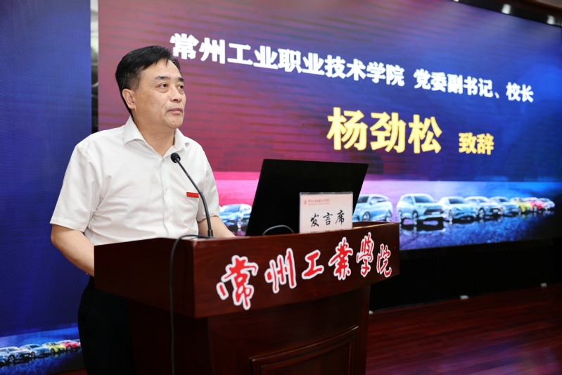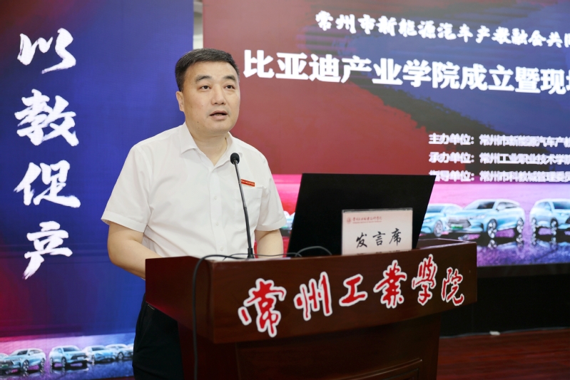 楊勁松代表全校師生對各位領導和來賓的到來表示熱烈歡迎。他表示,近年來,學校以深化產教融合為重點,以科教融匯為新方向,圍繞常州市“532”發展戰略,助力“新能源之都”建設。我校牽頭成立的常州市新能源汽車產教融合共同體,聚焦“發儲送用”環節,聯合新能源汽車產業鏈上下游龍頭企業、行業協會、科研院所和相關高校,在多方面開展深度合作,打造新能源汽車“制造+服務”產業鏈人才培養新生態。作為全球新能源汽車行業領軍企業,比亞迪產業學院的揭牌,標志著新能源汽車產教融合共同體建設邁上了新的臺階,各方將以“互利共贏、合作共贏”為原則,并肩同行,充分利用產業學院平臺不斷推動現場工程師人才培養模式落地生根,打造校企合作示范組合和產教深度融合共同體典范,為常州市“新能源之都”建設不斷提供人才保障和智力支持。