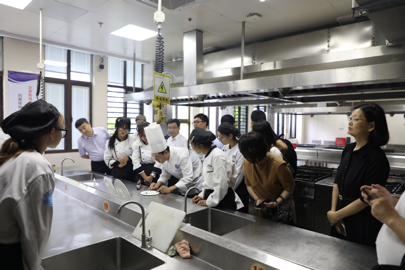 田浩對席海濤一行表示熱烈歡迎,帶領大家先后參觀了烹飪科技學院、旅游管理學院、工藝美術學院和校史館。大家實地調研了相關二級學院的招生規模、實訓條件、辦學水平、校企合作等。