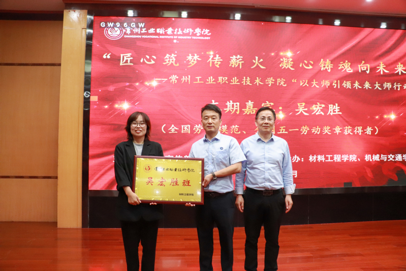 鄧建軍工匠學院院長袁飛、機械與交通學院院長徐偉共同為吳宏勝頒發了學校“以大師引領未來大師行動”師徒結對導師,青年教師傳幫帶導師聘書。吳宏勝和材料工程學院院長滕業方一起為23高分子531班授予“吳宏勝班”班牌,希望該班的同學們能夠在實踐中練就過硬本領、培育精益求精的工匠精神。