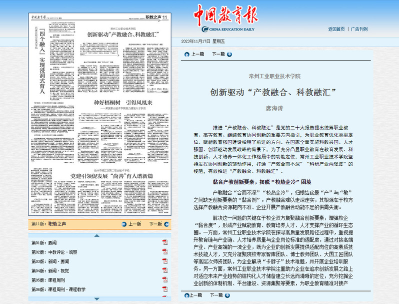 11月17日,《中國教育報》刊發(fā)了我校黨委書記席海濤的署名文章《常州工業(yè)職業(yè)技術學院:創(chuàng)新驅(qū)動“產(chǎn)教融合、科教融匯”》。文章指出,推進“產(chǎn)教融合、科教融匯”是黨的二十大報告提出統(tǒng)籌職業(yè)教育、高等教育、繼續(xù)教育協(xié)同創(chuàng)新的重要方向指引,為職業(yè)教育優(yōu)化類型定位、賦能教育強國建設指明了前進的方向。在國家全面實施科教興國、人才強國、創(chuàng)新驅(qū)動發(fā)展戰(zhàn)略的背景下,常州工業(yè)職業(yè)技術學院堅持發(fā)揮協(xié)同創(chuàng)新的驅(qū)動作用,打通“產(chǎn)教合而不深”“科研產(chǎn)業(yè)兩張皮”的梗阻,有效推進“產(chǎn)教融合、科教融匯”。