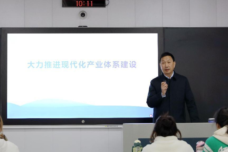 為推動(dòng)學(xué)習(xí)貫徹習(xí)近平新時(shí)代中國(guó)特色社會(huì)主義思想走深走實(shí),11月24日上午,校黨委委員、副校長(zhǎng)姚慶文走進(jìn)課堂,以“大力推進(jìn)現(xiàn)代化產(chǎn)業(yè)體系建設(shè)”為題,為2023級(jí)學(xué)生講授了一堂既深刻又生動(dòng)的專題思政課。
