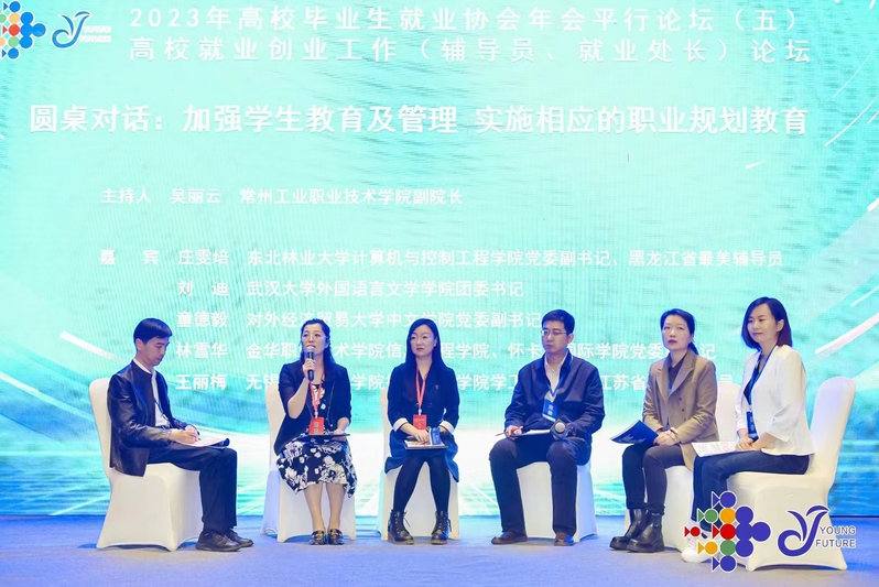 吳麗云主持加強學生教育及管理、實施相應的職業規劃教育交流會。會議中,參會代表就各校開展學生職業生涯規劃的相關經驗進行了交流。