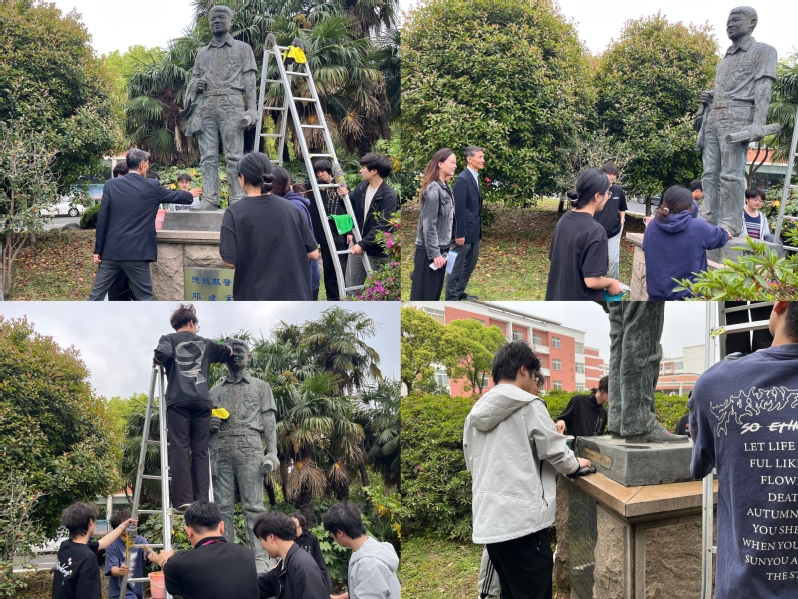 故事余韻中,師生們手持工具分組行動。有人半蹲擦拭基座前的一行字:“德技雙馨”,有人爬上梯子輕拭塑像眉梢上的灰塵,24數媒332周恒同學的感悟樸實而深刻:“擦塑像時發現,大國工匠鄧建軍的目光始終望向教學樓方向,仿佛在看我們的未來。”
