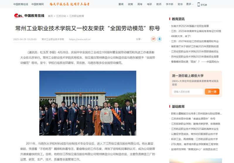 中國教育在線:常州工業職業技術學院又一校友榮獲“全國勞動模范”稱號