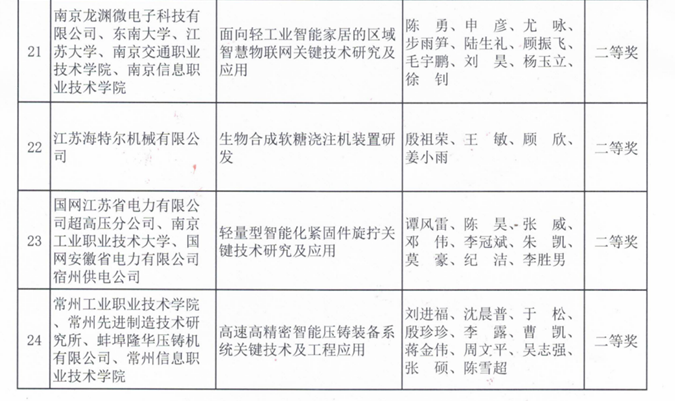 由我校和常州先進制造技術研究所,蚌埠隆華壓鑄機有限公司,常州信息職業技術學院聯合申報完成,我校劉進福、沈晨普、于松、蔣金偉、張碩等人主要完成的《高速高精密智能壓鑄裝備系統關鍵技術及工程應用》獲技術進步獎二等獎;由我校和江蘇尚純自動化技術有限公司、南京航空航天大學、常州先進制造技術研究所聯合申報完成,我校李宏哲、薛茂權、蔣正炎、劉進福、杜康康、于松等人主要完成的《新能源電池電解液高精密灌裝系統關鍵技術與產業化研究》獲技術進步獎三等獎。