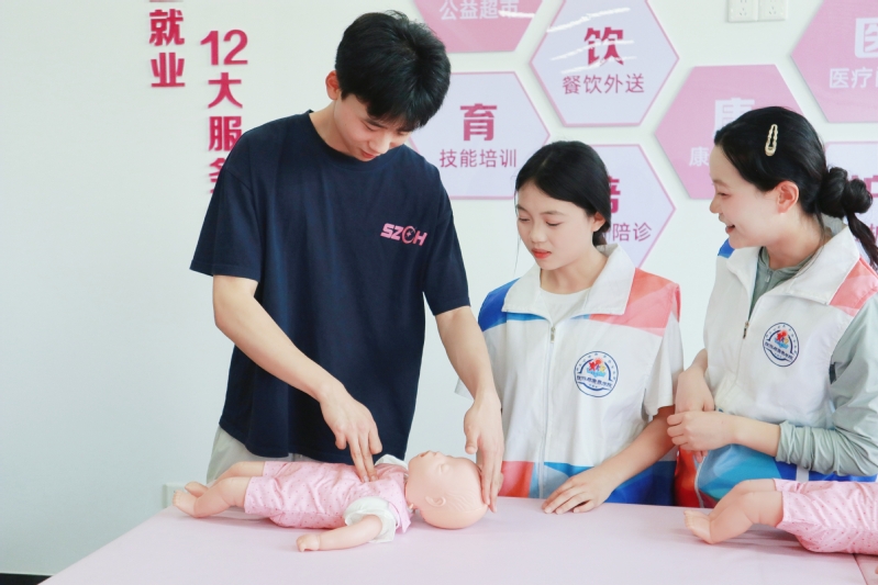 “嬰幼兒心肺復蘇與成人操作存在顯著差異,需特別注意力度和位置!”在嬰幼兒救護專區,24幼兒331班志愿者凌冰冰同學手持嬰兒模型,逐步演示嬰幼兒心肺復蘇操作步驟:“針對1歲以下嬰兒,施救者可以用手掌圍攏新生兒和小嬰兒的胸廓,需用兩指垂直按壓胸骨下半段,深度約4厘米,頻率每分鐘100-120次”?,F場參與者兩人一組,借助嬰兒模擬人反復練習。學生陳怡銘表示,按壓時總怕用力過猛傷到孩子,也擔心按不到位,細節真的會影響生命安危。