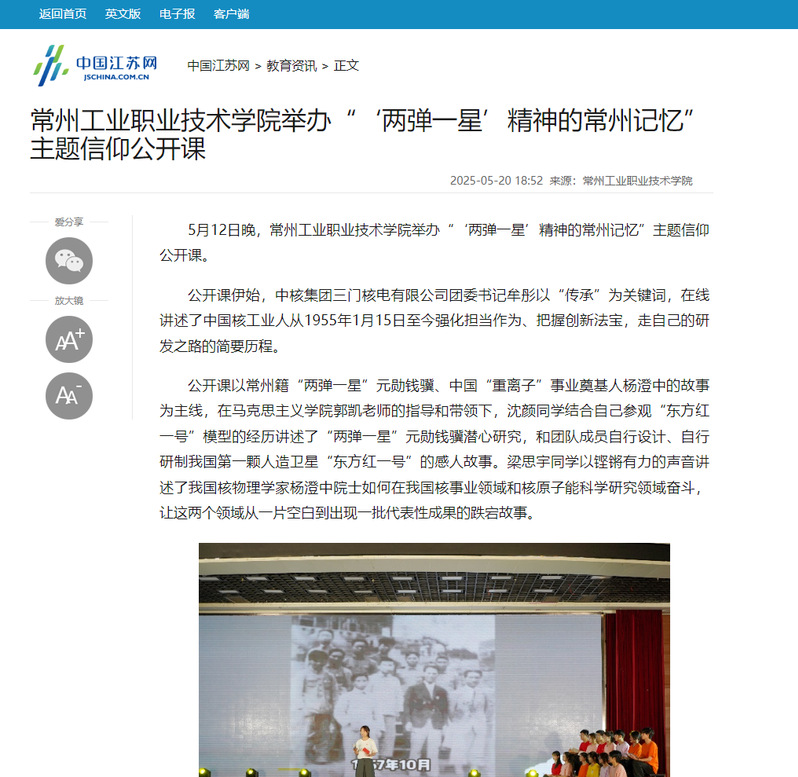中國江蘇網(wǎng):常州工業(yè)職業(yè)技術(shù)學(xué)院舉辦“‘兩彈一星’精神的常州記憶”主題信仰公開課